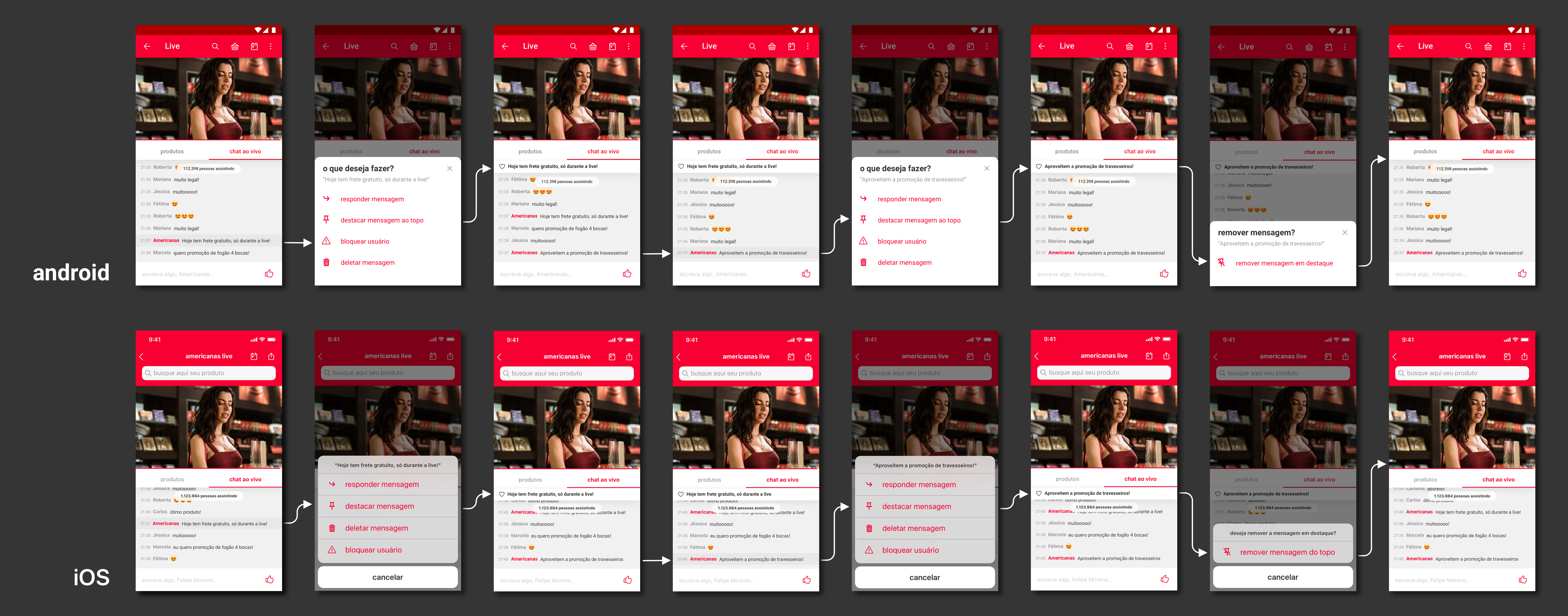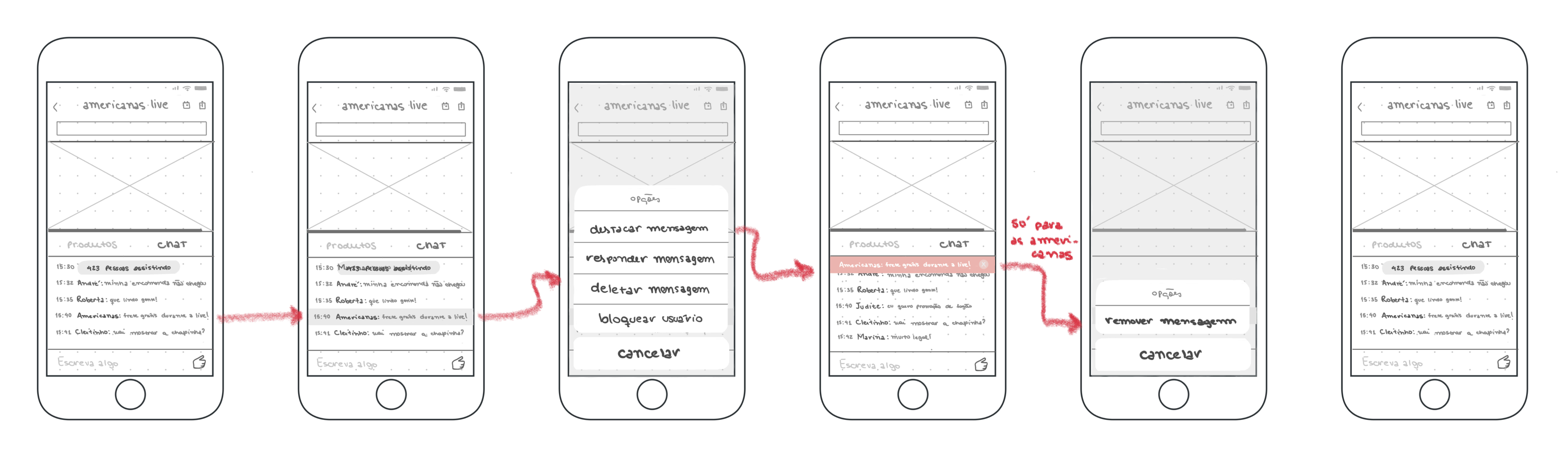 Como já havia sido apontado pelo time de desenvolvimento durante o design da Pré-Live, não seria possível posicionar nenhum componente em frente ao vídeo, resultando que a solução deveria ser trabalhada no chat.